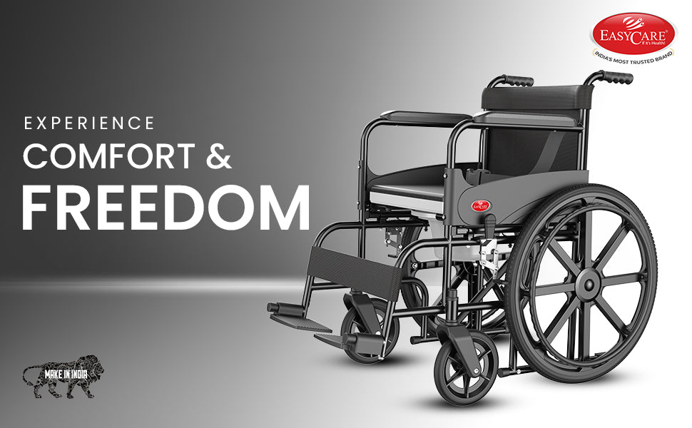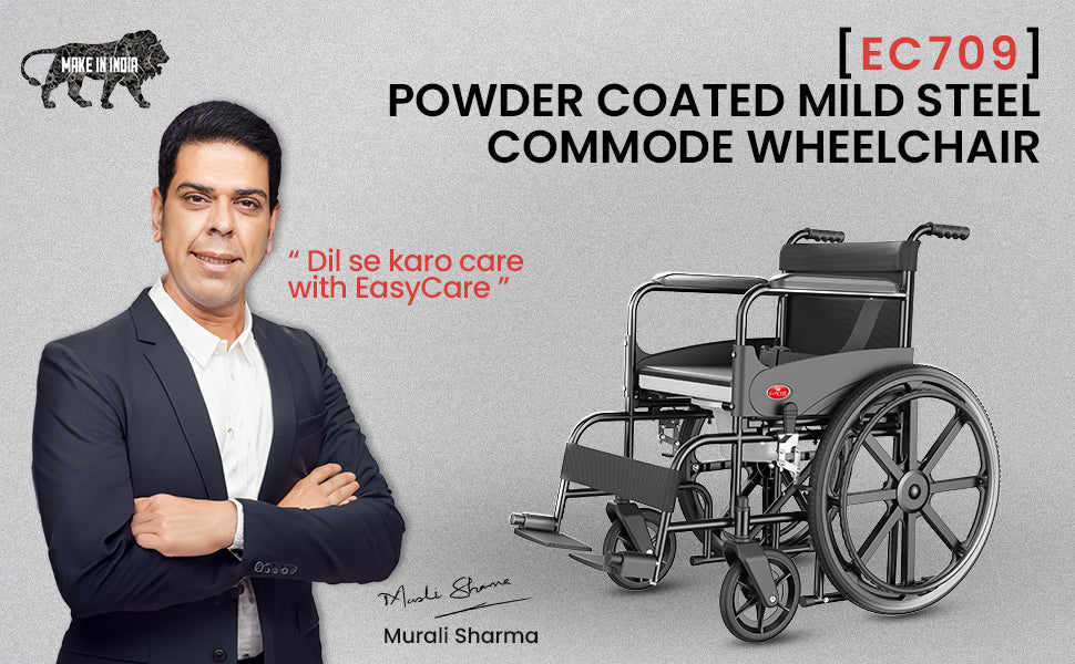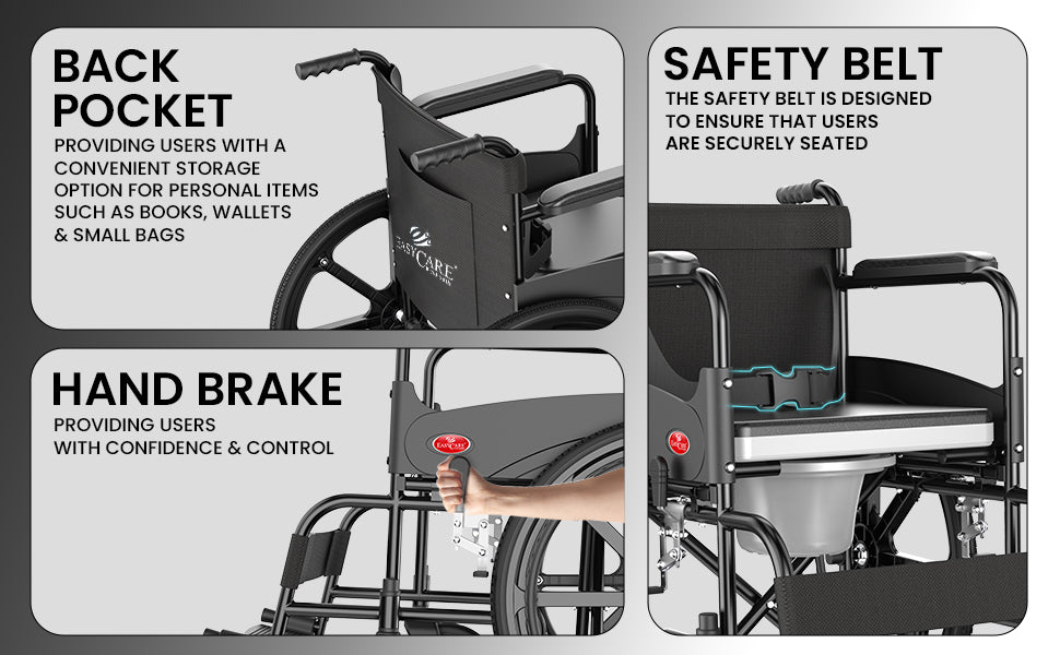 The Easycare EC709 Commode Wheelchair is thoughtfully engineered for elderly users and patients. It features rear-wheel manual locking brakes and easy-squeeze hand brakes for safe and controlled movement— ideal for wheelchairs for old people and wheelchairs for patients who require stability and support during transfers.