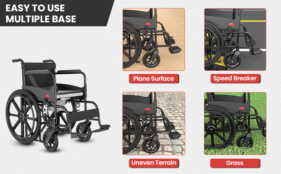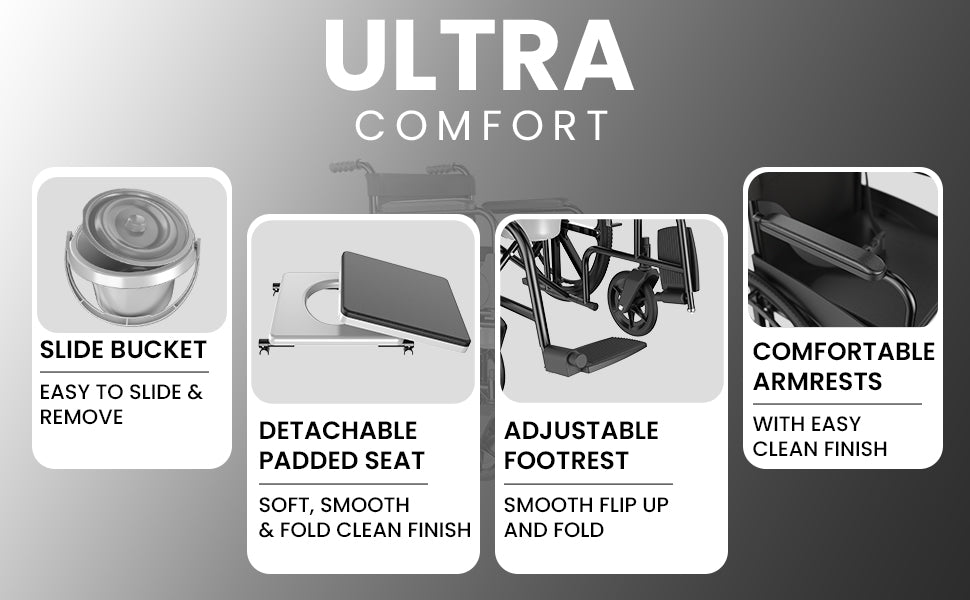Designed with full-length cushioned armrests and detachable footrests, this commode wheelchair allows easy entry and exit. Whether you're recovering from surgery or managing limited mobility, the seat ensures optimal comfort. Perfect for indoor wheelchair use and wheelchairs for seniors.