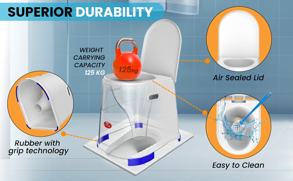 Designed specifically for adults and seniors, this commode chair toilet fits over most Indian-style toilets. It can safely support users up to 110 kg (about 242 pounds), offering solid stability for a wide range of body types. The raised height also means you won't need to squat as much, which eases strain on your knees and joints.
