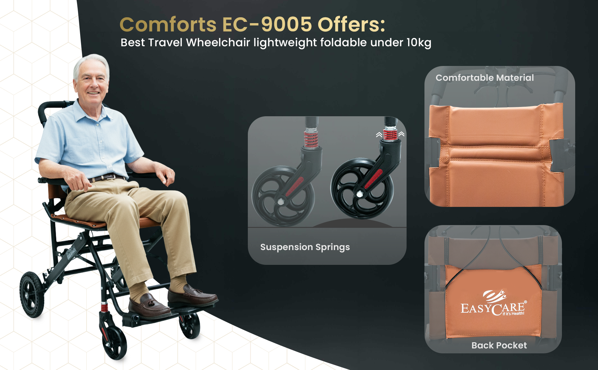 EASYCARE Portable Mild Steel Traveling Wheelchair with 105 kg Weight Capacity, Attendant Brake, Safety Belt, Back Pocket, Carry Bag, and Smooth Mobility for Travel (EC9005)