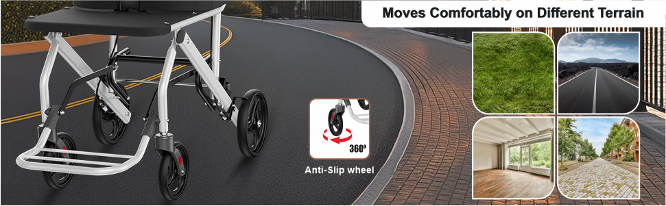 Yes, it’s suitable for light outdoor use. The 360° rotating front wheels and anti-slip design help maintain stability on flat and slightly uneven terrains, such as tiled pavements or short grassy areas.