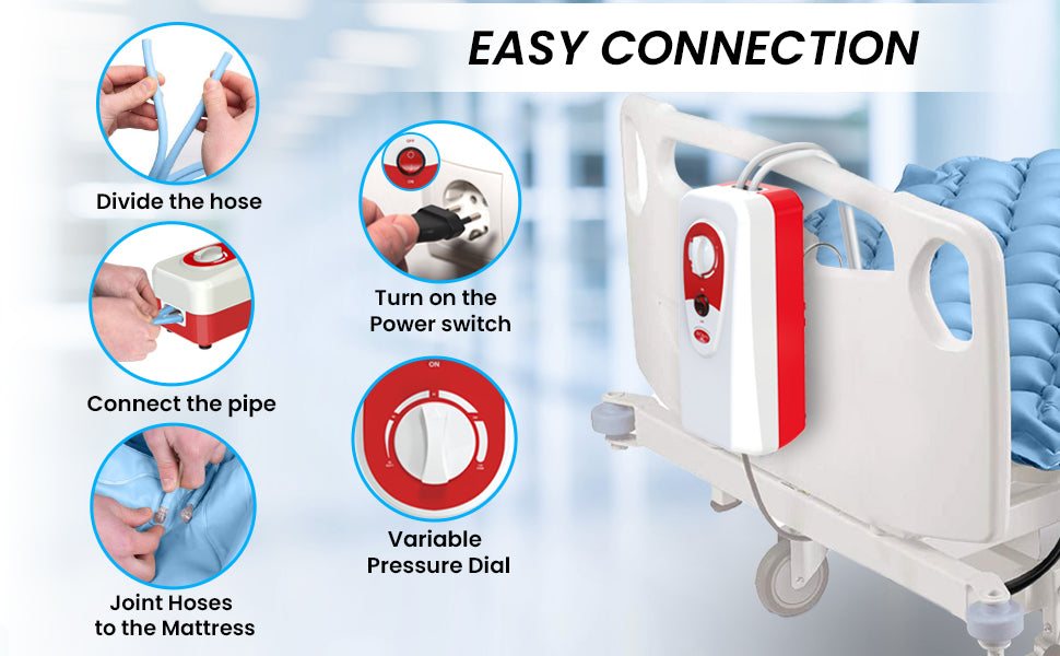 Made from fine Medical Grade PVC, this mattress is gentle on the skin, non-toxic, and durable—ensuring patient safety and long-term use. The mattress system includes a quiet, vibration-free air pump and features alternate pressure therapy to support muscle relaxation, better circulation, and ultimate patient comfort.
