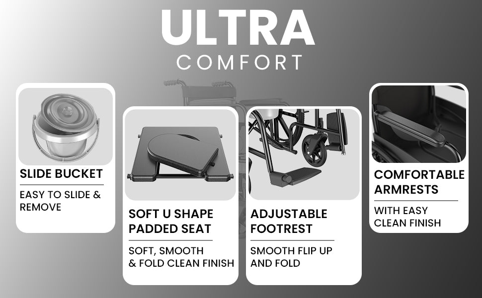 A: It is ideal for elderly individuals, post-operative patients, or anyone needing a supportive, indoor commode wheelchair with a secure and compact design.