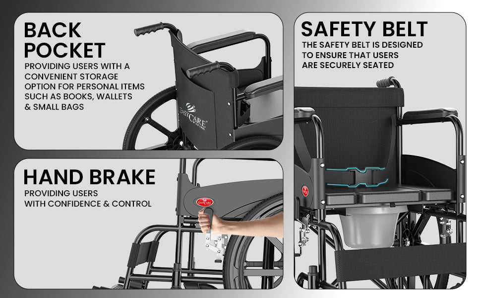 The Easycare U-Cut Commode Wheelchair is designed with advanced safety features including rear-wheel manual locking brakes and easy-squeeze hand brakes. These ensure stable transfers, especially for elderly users and patients with limited mobility. Ideal for those seeking wheelchairs for old people and wheelchairs for patients.