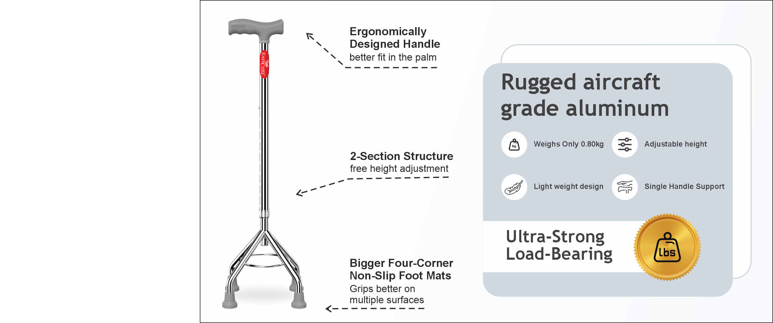 Walk with Confidence. Live with Dignity. The EasyCare Quad Cane is designed for seniors and mobility-challenged individuals who want to stay active without fear. Whether you're recovering from surgery, managing balance issues, or simply need extra support—this cane gives you the stability to move freely.