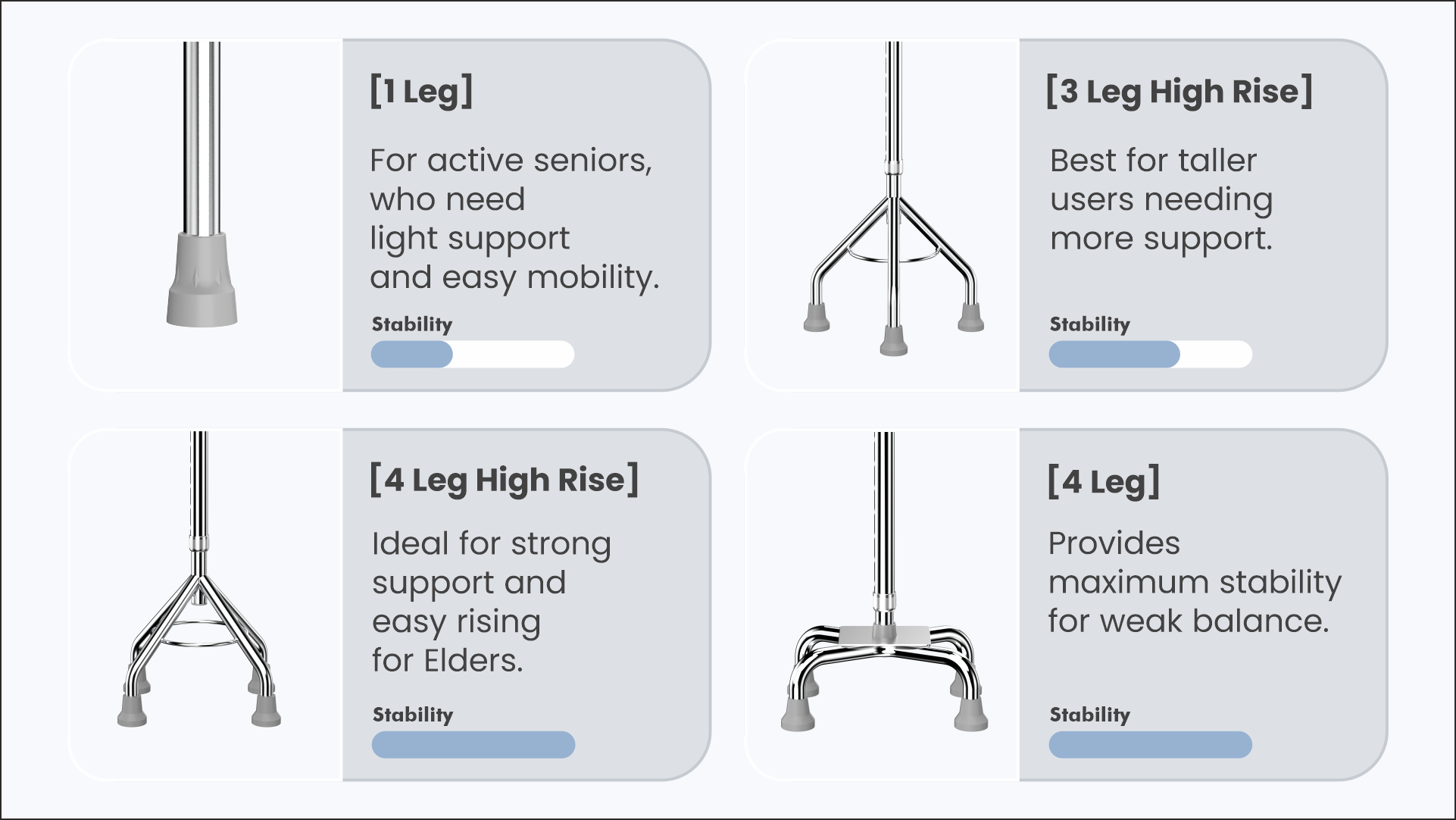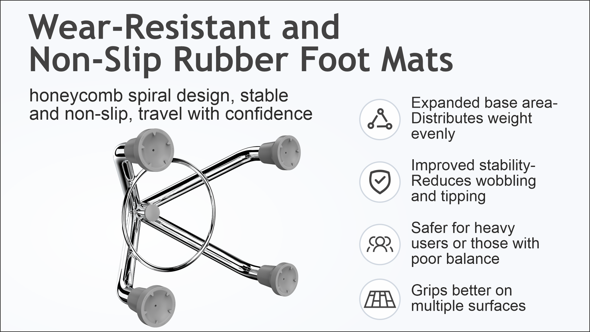Stability That Reassures. Wobbly steps and uneven surfaces can feel risky. That’s why our cane features a strong four-legged base with slip-resistant rubber tips. It stands firm—indoors, outdoors, even on stairs—so you don’t have to.